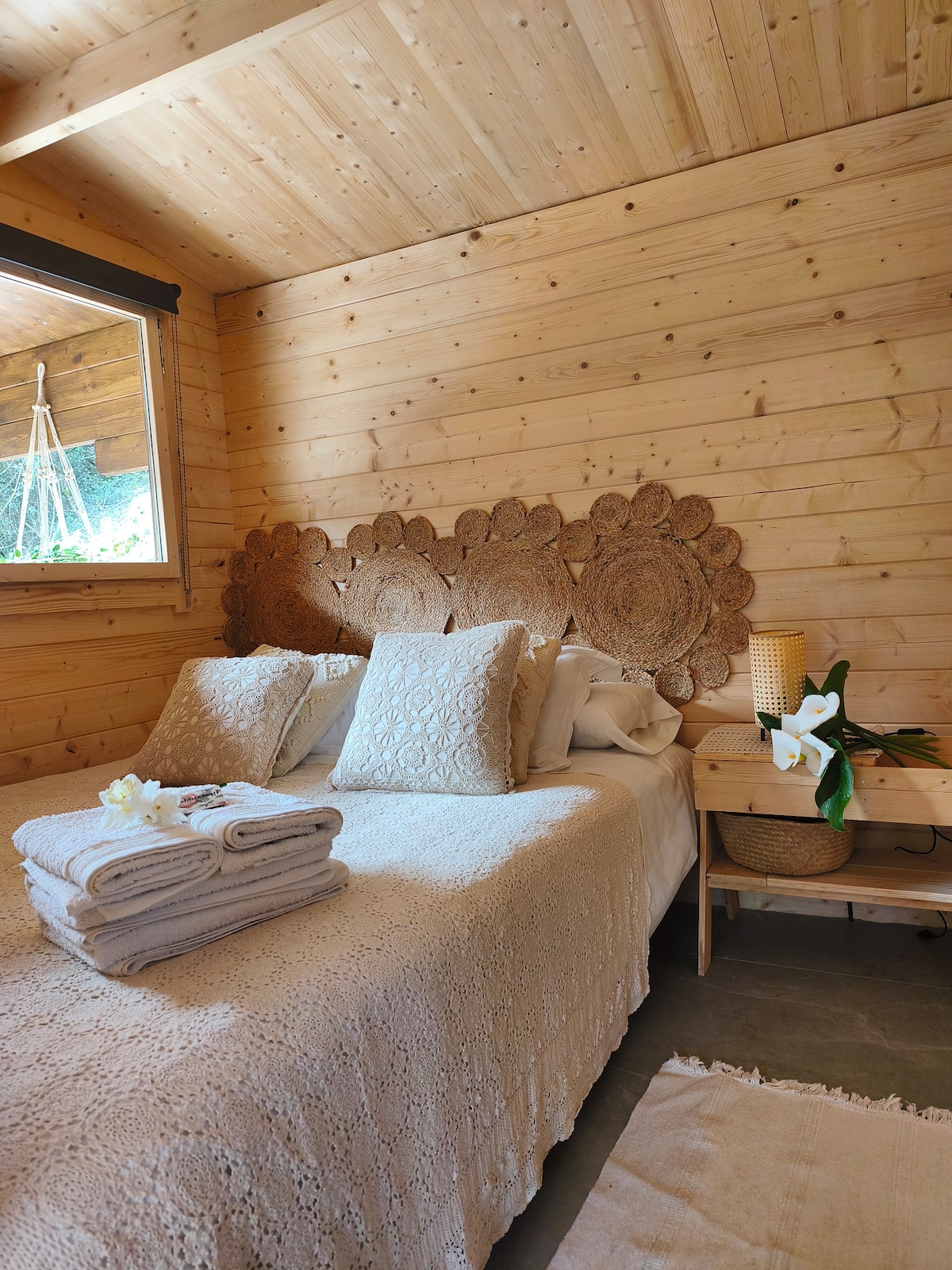 La cabaña se sitúa en un hermoso paraje, a solo 10 minutos de Santiago de Compostela, en la que pasar unos tranquilos y románticos días rodeados de naturaleza al lado del río Ulla, en un nuevo concepto de turismo rural. Con capacidad para 2 personas* en 27 funcionales m2, repartidos en baño, dormitorio, cocina, zona de estar, sofá cama, TV, Wi-Fi, aire acondicionado y una terraza exterior bajo abedules, hayas, fresnos….