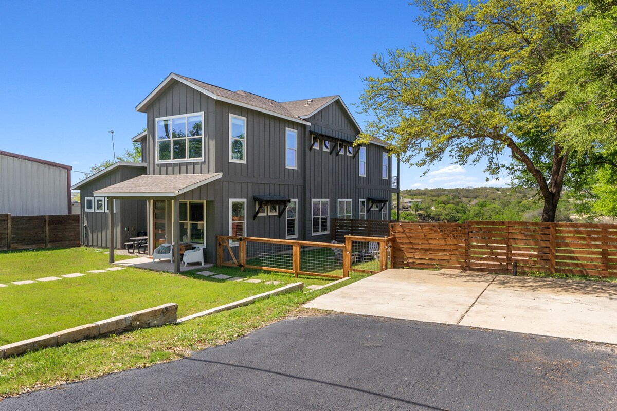 Welcome to the Riverhaus! Established in 2020, this sanctuary was thoughtfully designed with comfort in mind. This 2-acre gated estate with a 1,900 sqft home and 100' of waterfront on the Pedernales River sleeps 8 comfortably and boasts a private outdoor Biergarten as well as a cabinet of lawn games, two firepits, multiple seating areas, and a fleet of non-motorized boats to enjoy on the river. Situated on the upper level of the property is a spacious two-story home. Take advantage of numerous amenties including a gameroom, lending library, two work stations, Roku television, Wii gaming system and Yoga equipment. Enjoy your morning coffee on one of the two decks as you listen to the sound of windchimes and wildlife. On the lower level under a canopy of old Oak trees, you can roast s'mores on another firepit or walk down to the water's edge to fish, swim, kayak, canoe or paddleboard. Life jackets are provided (Two adult, four child, & two infant). ***Disclaimer*** River levels are currently very low at this time.