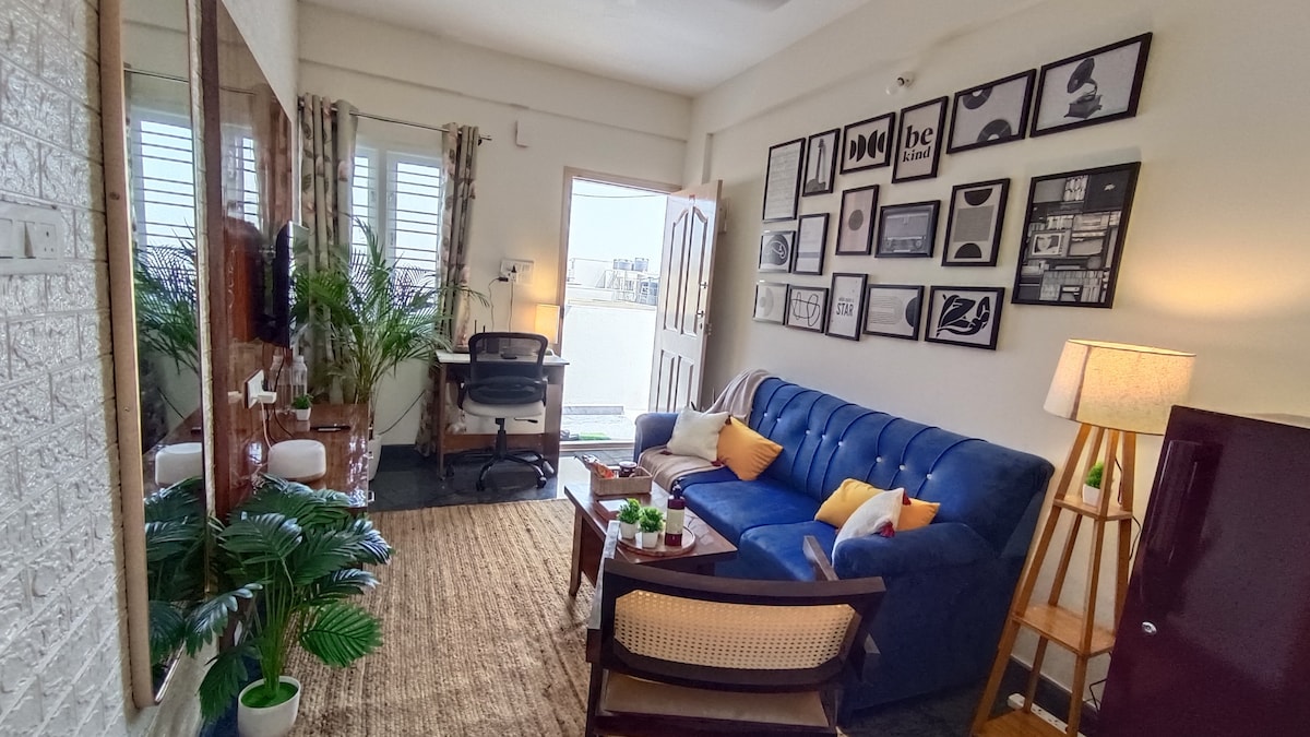Amplia suite 1BHK de diseño de 600 pies cuadrados con balcón privado | Wifi de fibra óptica de alta velocidad y TV inteligente con plataformas de streaming, escritorio de trabajo/comedor, respaldo de energía las 24 horas, los 7 días de la semana para trabajo y comodidad ininterrumpidos | Cama tamaño king Luxe y colchón ortopédico, armarios de madera para almacenamiento | Cocina pequeña totalmente equipada | Sofá cama en la sala de estar , ocupación máxima 4 | Acceso al ascensor, servicio de limpieza profesional y acceso a lavandería de pago en el sitio para estancias largas | Ubicado en el centro de Bangalore | LGBTQIA++ Afirmativo