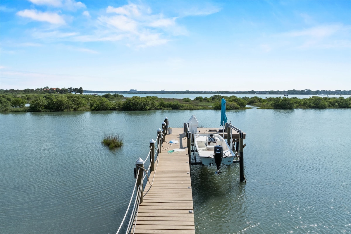 * Construido en 2023: muebles y sábanas de lujo en la costa * Destacado en la revista Good Housekeeping de 2024🌟 * 2 suites tamaño king (1 en cada piso) | 2 dormitorios tamaño queen | 3,5 baños * Piscina privada de agua salada y spa/jacuzzi. * Cabaña junto a la piscina | Cocina exterior | Porche delantero * Bicicletas, juguetes de playa, sillas de playa. * Paisajismo tropical exuberante * 0.2 millas - hermosa playa tranquila * 5,5 millas: centro histórico de San Agustín, ¡la ciudad más antigua de Estados Unidos! * 0.2 millas - Cap's Restaurant para cenar al atardecer en el agua