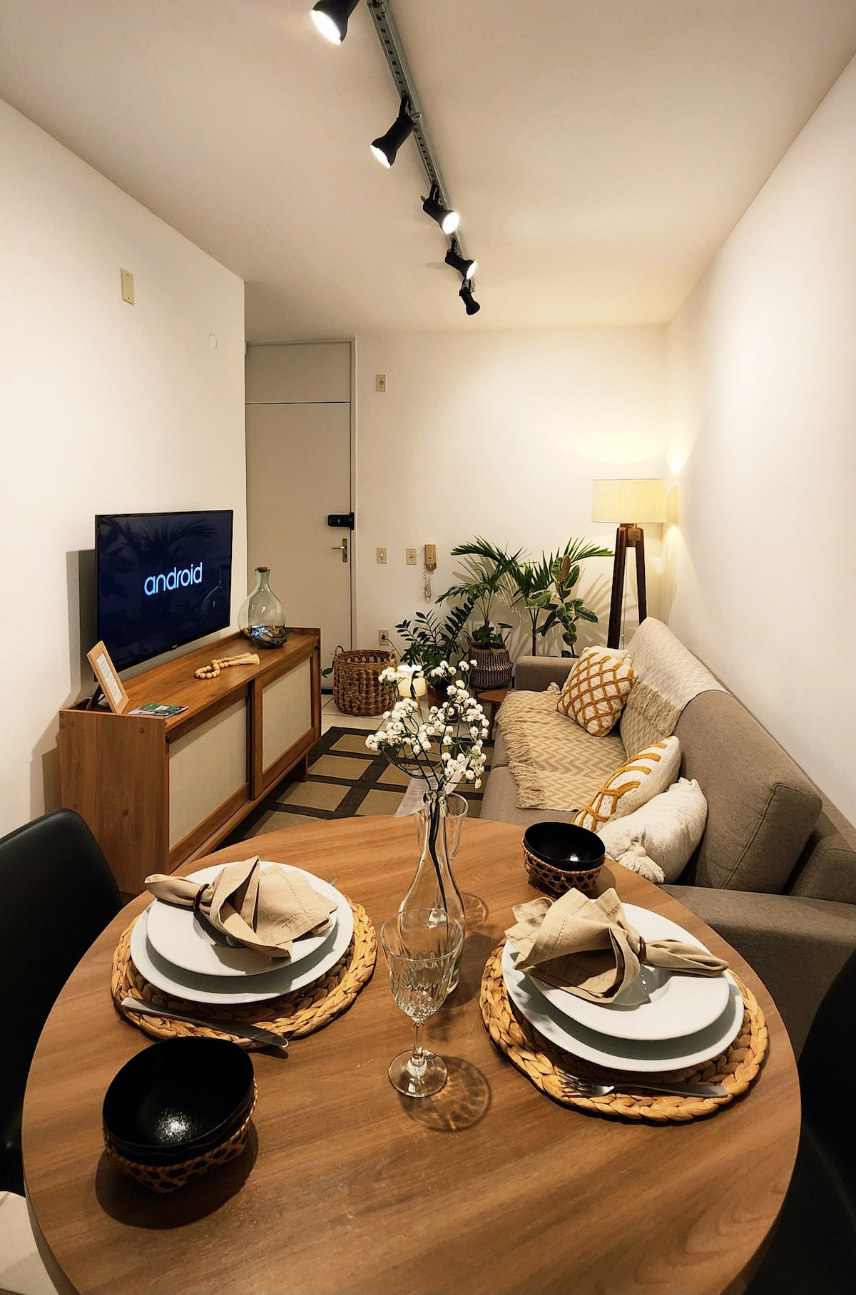 Piso en Tropical Executive Hotel bellamente diseñado con hermosas vistas al río. Habitación con aire acondicionado, una cama tamaño queen Ortobom, 1000 cables, TV de 45pulgadas, wifi, mesa de comedor de 2 plazas y sofá. Cocina bien equipada con 2 cocinas bucales, fregador, purificador de agua, cafetera Dulce Gusto + cápsulas, sartenes, licuadora, nevera, vajilla, utensilios de cocina y microondas.
