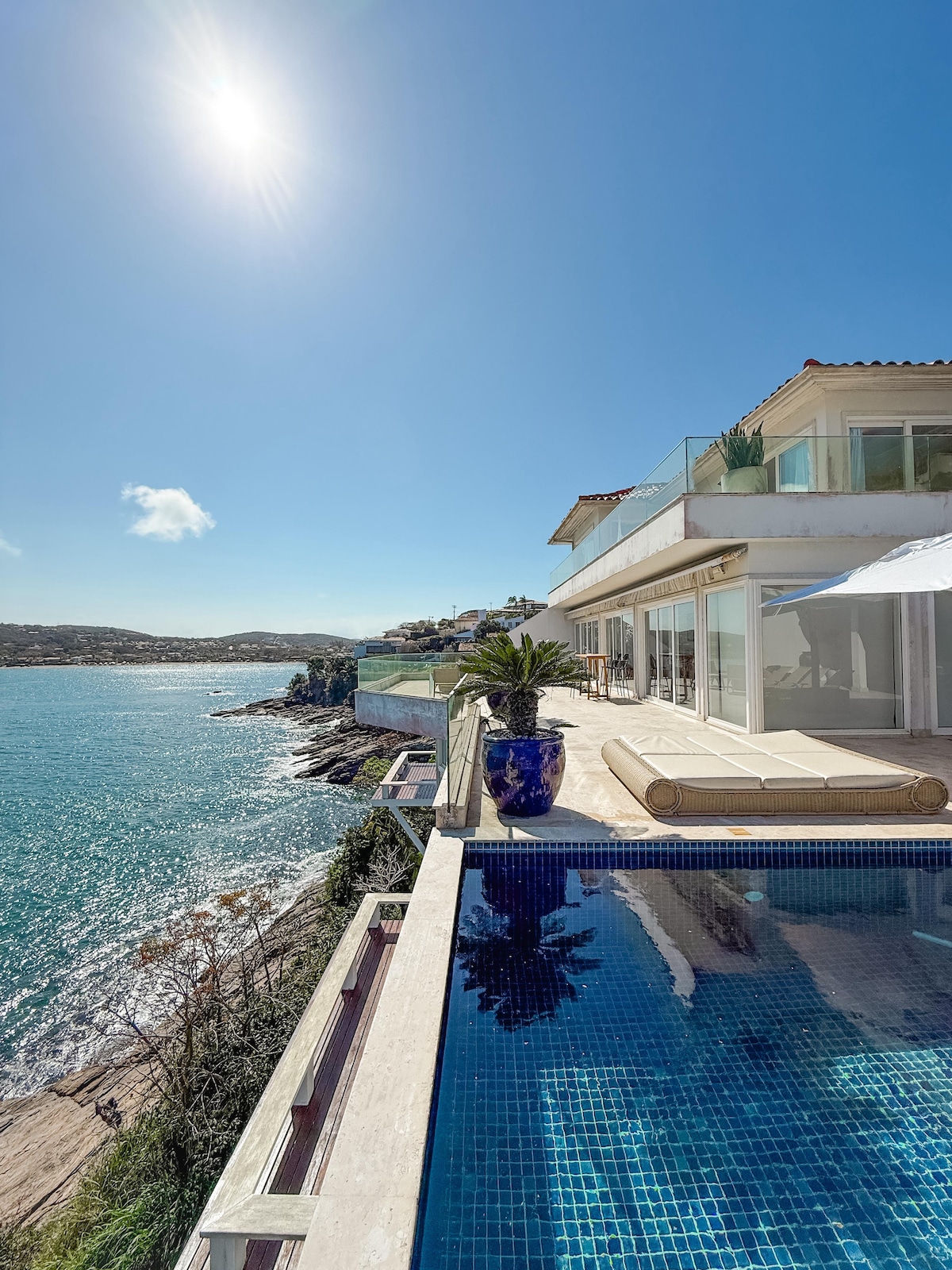 Residencia deslumbrante en la Rua Q de Ferradura, donde disfrutar del amplio paisaje con vistas de la playa de Ferradura, las olas, las rocas, colinas, gran piscina, exuberante jardín y vista panorámica hasta los cruceros que llegan a Buzios. Arquitectura de diseño, materiales, muebles y equipamiento de la mejor calidad, ventilada y luminosa, decks, amplios ventanales. Ideal para tus vacaciones familiares o con amigos, en una casa cálida y sofisticada, rodeado de naturaleza