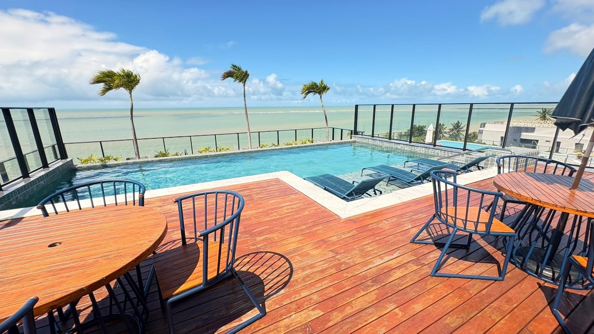 Piso en el punto más oriental de las Américas, frente al mar, jacuzzi privado, aire acondicionado central, recepción 24/7, checkin/checkout fácil, extrema seguridad para los huéspedes con sistema de huellas digitales de ambiente a ambiente, gimnasio, lavadora/secadora, garaje rotativo, sala de reuniones y estudio, azotea impecable con 2 gourmet, jacuzzis, piscina con borde infinito, una vista divina y tranquila. Asegúrese de vivir la mejor experiencia en el más alto nivel de JPA.