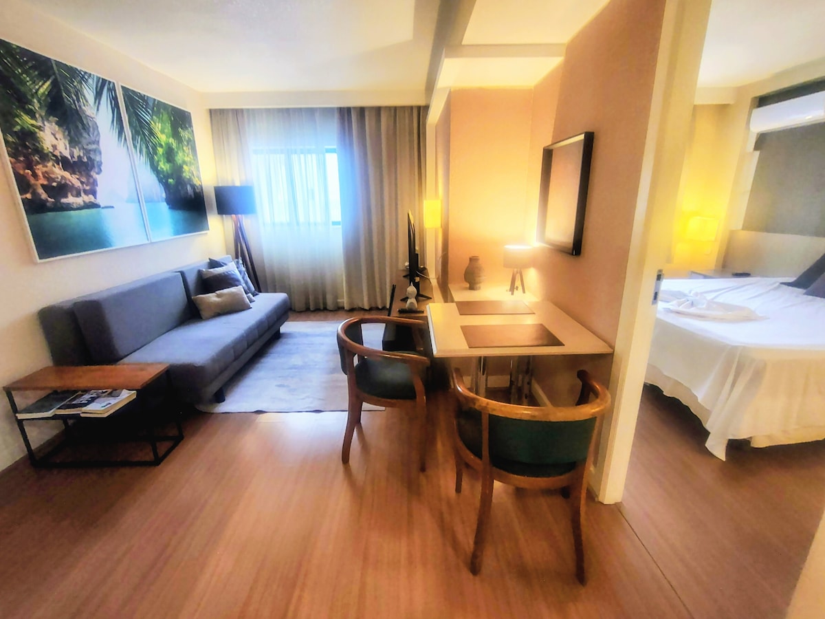 Estudio de lujo frente al Shopping Curitiba, con plaza de estacionamiento