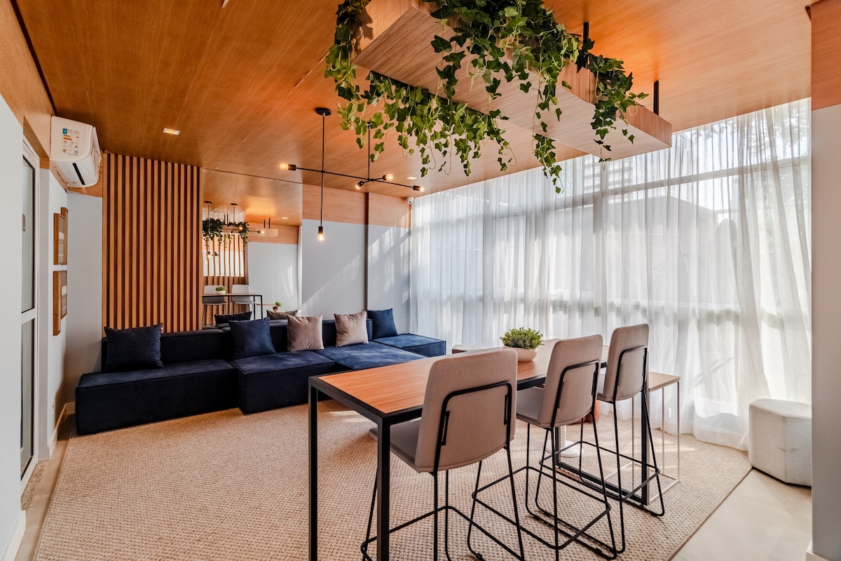 ATENCIÓN: Para utilizar el servicio de estacionamiento, se debe notificar con antelación. Consulta la entrada al lugar en las fotos. Loft moderno bien decorado con hermosas vistas urbanas de São Paulo. Ofrece una cama tamaño queen con pillowtop de 10 cm, TV de 50 pulgadas y un ambiente iluminado por el sol. La cocina está equipada con utensilios de calidad e incluye mesa de comedor y encimera. El armario tiene un buen espacio de almacenamiento y el apartamento tiene aire acondicionado para la comodidad durante todo el año.