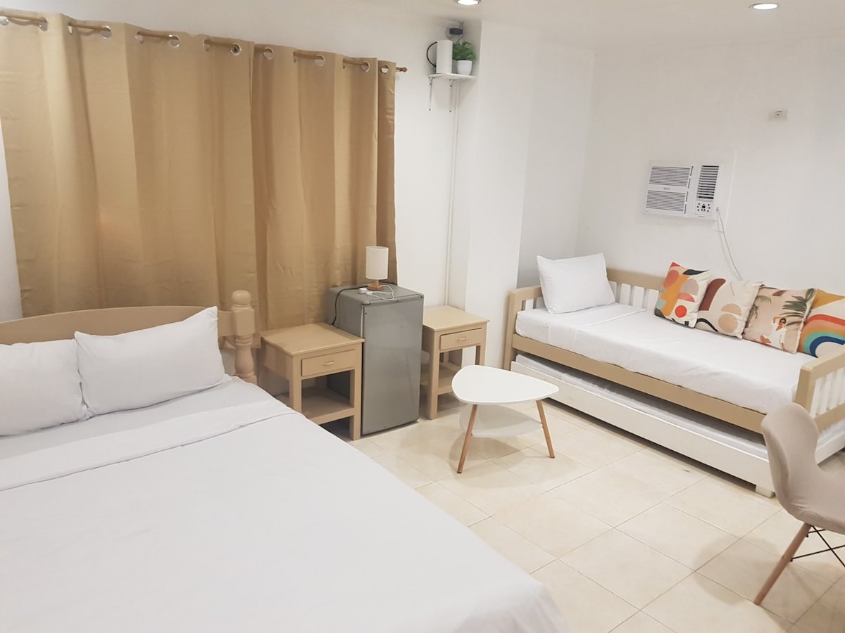 Este es un dormitorio ACREDITADO COMO PUNTO frente a la playa está amueblado con buen gusto con arte local y está equipado con comodidades convencionales, como aire acondicionado, duchas frías y calientes, y un televisor de pantalla plana. La acogedora cama queen está vestida con ropa de cama limpia y blanca y tiene mesas auxiliares minimalistas en ambos lados. El apartamento cuenta con balcón que ofrece excelentes vistas de la playa Bulabog. La estación 2 de White Beach está a menos de diez minutos a pie.