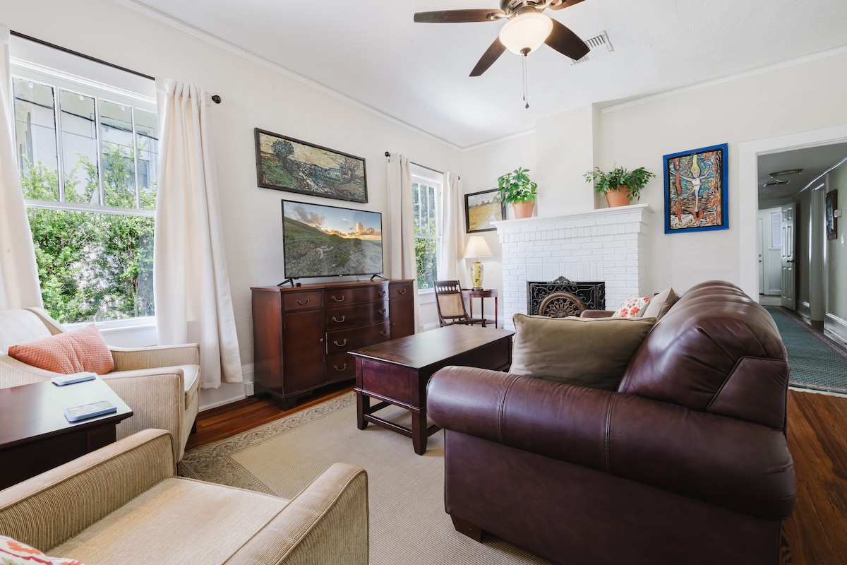 Vení a relajarte en un pedazo de la historia. ¡Nuestro bungalow histórico de los años 20 ofrece justo eso! Renovamos este alojamiento para ofrecer todas las comodidades que esperás, sin dejar de lado su personalidad única. Te encantará nuestra ubicación privilegiada, a solo unas cuadras del animado corazón del centro y el hermoso campus de la Universidad de Stetson. Comenzá el día en la galería delantera, perfecta para disfrutar del barrio, o encontrá un refugio tranquilo en la galería trasera con vista al patio vallado, un refugio para los niños.