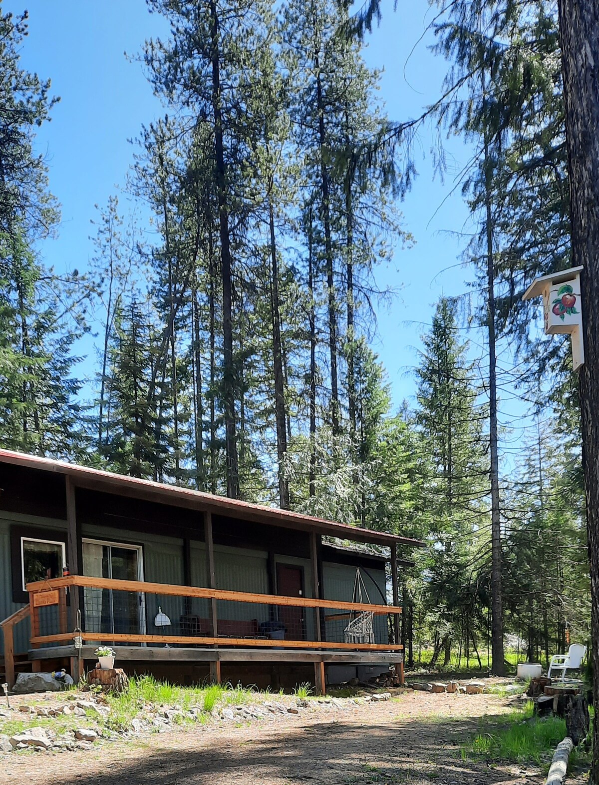 You'll be very comfortable in this fully equipped two bedroom one bath cottage with everything you need including a full kitchen and in-house laundry. Only 5 minutes from downtown Collville, this cottage is ideal for business in town while also providing the peace and quiet of a country setting. There are several gravel roads that allow for pleasant walks and creek access about 10 minutes walking distance. Forest view from front porch You'll enjoy this peaceful and quiet place.