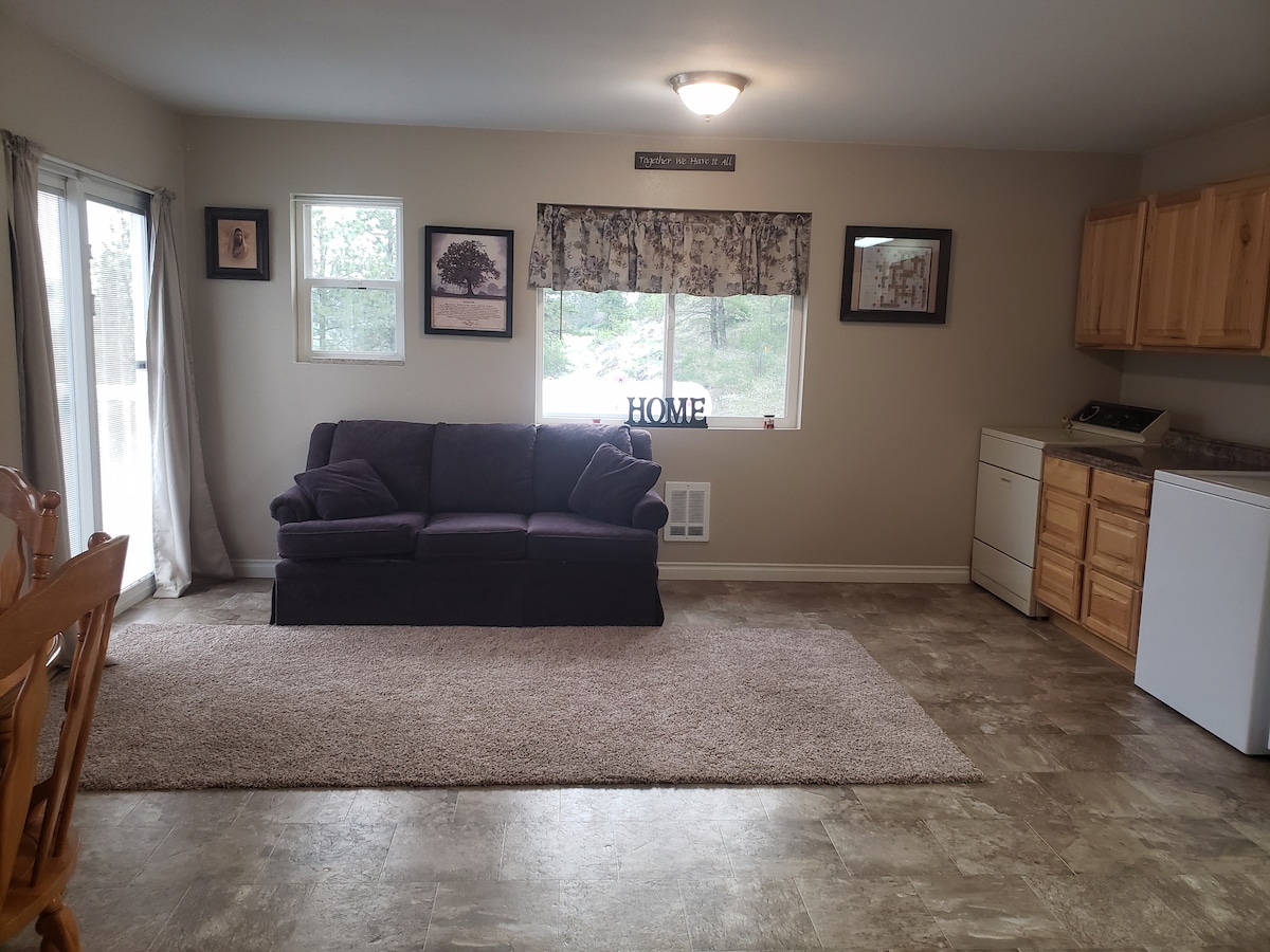 Take it easy at this unique and tranquil getaway. Comfortable and spacious one bedroom, one bath apartment with kitchen and laundry amenities. King size comfortable bed and spacious shower. Beautiful views from every window and your own private deck. Enjoy hiking and exploring on this 40 acre parcel.