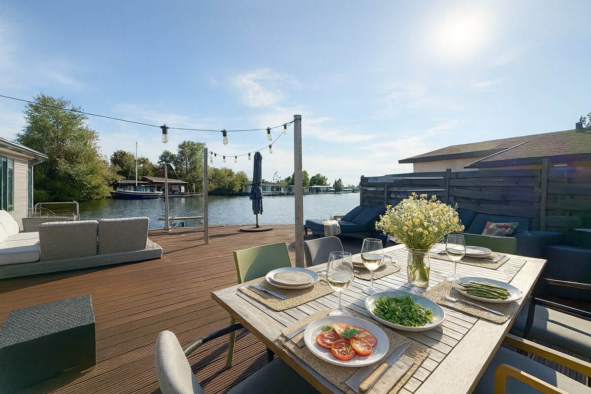 ✨Bij Happy op de Vecht schijnt altijd de zon✨ Overnacht in een romantische tiny houseboat aan een idyllische privétuin aan de Vecht omringd door rust en kabbelend water. Geniet van magische zonsondergangen vanaf je terras, spring zo het water in voor een frisse duik of verken de Vecht al suppend op onze boards of met een elektrische loungeboot. Romantiek, vrijheid en ultiem zomergevoel in je eigen tiny houseboat. Inclusief privé sauna, luxe Optidee beddengoed, koffie, thee en optioneel ontbijt.