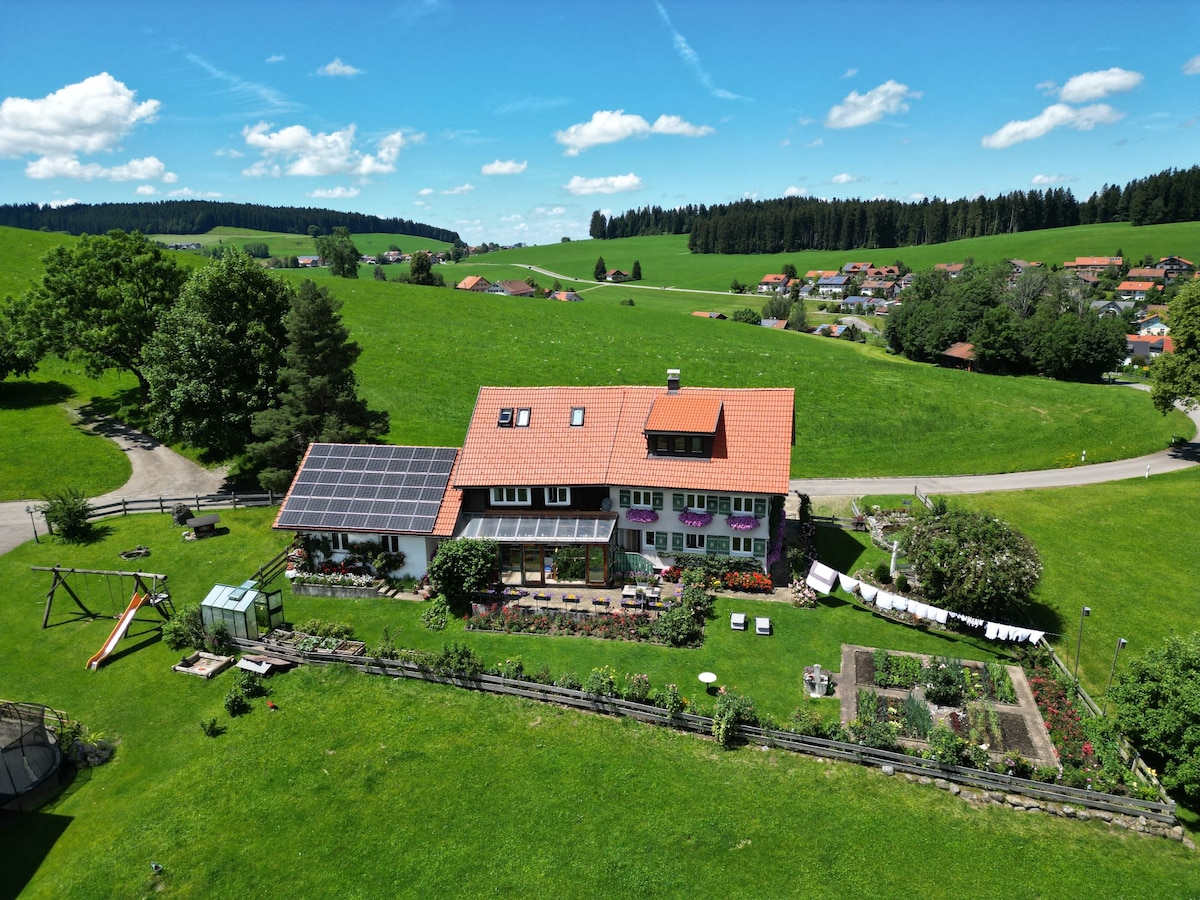 Unser Haus liegt eingebettet in Felder, die der Löwenzahn im Frühjahr gelb färbt und der Schnee im Winter weiß. Im Sommer weht der Duft von gemähten Wiesen durch die Luft und wenn es auf den Herbst zugeht, tragen die Obstbäume und der Garten direkt vor der Ferienwohnung Früchte. Hier im Allgäu können Sie der Natur wirklich nah sein. Ausflugsziele zum Wandern und Radeln sind von hier aus gut zu erreichen, aber auch Wohnung, Garten und der nahegelegenen Wald laden ein, in Ruhe zu entspannen.