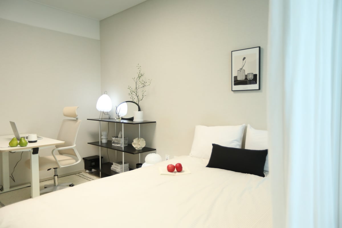 Noemma는 일과 생활 사이의 균형을 위해 설계된 공간입니다. 갑작스레 잡힌 업무 일정의 비즈니스 고객과 여행자의 장기 체류에도 불편함 없는 구조와 비품, 차분한 분위기를 제공합니다. 🌿 원룸 형태로 퀸사이즈의 침대가 있는 침실, 간단한 요리가 가능한 주방, Bar테이블이 있는 무드 있는 테라스와 욕실의 구조인 공간입니다. 🌵 장기 투숙에 최적화된 조용한 생활 공간. 일하는 사람, 휴식을 추구하는 여행자를 위한 실용적이고 아늑한 숙박을 지향합니다. 🧃 바쁜 일상 속에서도 생각은 정리되고, 생활은 안정되는 곳. Noemma는 머무는 동안의 ‘리듬’을 존중합니다. 🌃 동탄신도시의 풍경이 보이는 테라스에서 낮에는 햇살 가득 받으며 차 한잔과 업무 또는 음악 감상을, 밤에는 무드 있는 등과 야경을 벗삼아 와인 한잔을, 그런 무드가 어울리는 곳, 'Noemma'입니다. 동탄의 중심 상권에 위치하면서도 조용하여 사생활을 즐길 수 있는 Noemma에서 편안한 시간 되세요