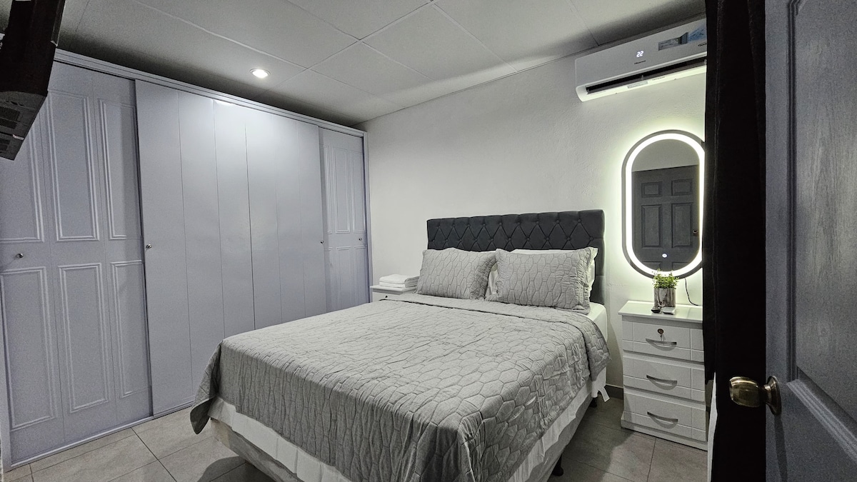 Disfruta de una experiencia con estilo en San Salvador con este alojamiento céntrico. Al realizar tu reserva, obtienes acceso inmediato a supermercados, restaurantes, el Centro Histórico, centros comerciales y hospitales. Con capacidad de hasta 4 huéspedes. Ofrecemos 2 habitaciones con un total de 3 camas (2 individuales y 1 queen), las habitaciones y sala poseen A/C; la cocina esta totalmente equipada. Contamos con parqueo gratuito, seguridad las 24H y cámara de seguridad. Internet 100MB.