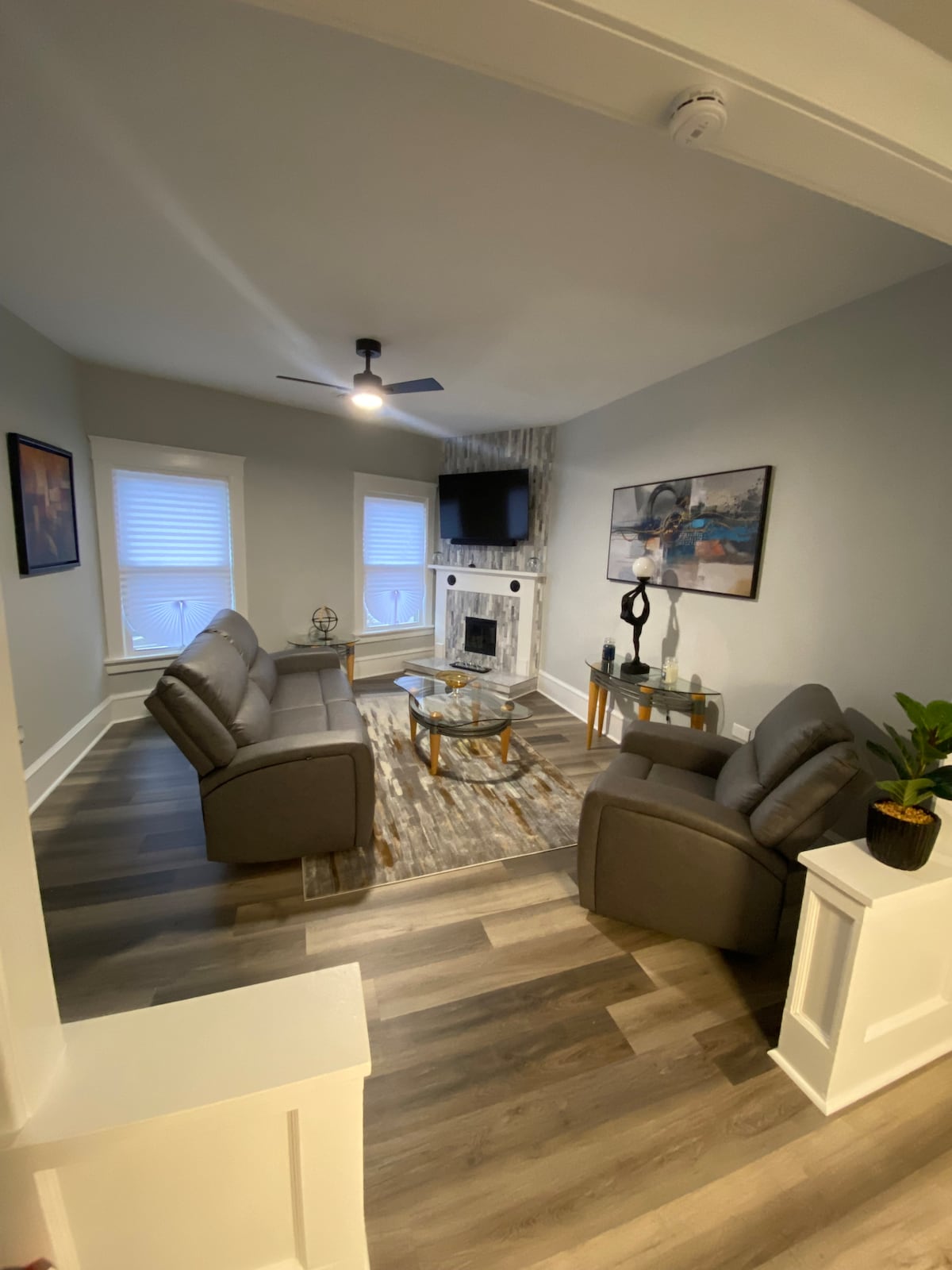 Recently renovated, this cozy 2-story colonial offers a full kitchen with gas range, espresso machine, air fryer, dishwasher, and wine fridge. The kitchen side door opens to a fenced-in backyard. The living room has a sofa, large SmartTV and a dining area with seating for 4. The main level bedroom has a twin trundle bed and vanity. Upstairs is a large loft-style bedroom with king-size bed, faux fireplace, work desk, closet and sturdy oak storage furniture. Washer/dryer available in basement.