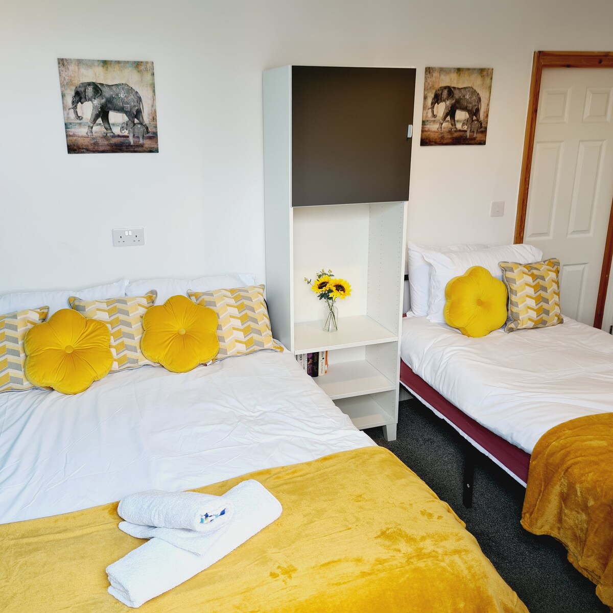 COCINA COMEDOR: La cocina bien presentada está equipada con una selección de utensilios, ollas, sartenes y todos los electrodomésticos que necesitarás para tu estancia. SALA DE ESTAR: la elegante y moderna sala de estar está situada en la planta baja de la propiedad y consta de 1 sofá grande. La habitación también cuenta con Smart TV. DORMITORIO: ambos con camas de matrimonio. BAÑOS: baño con ducha recién instalado. CARACTERÍSTICAS EXTERIORES: Amplio jardín privado con asientos. Aparcamiento en la unidad.
