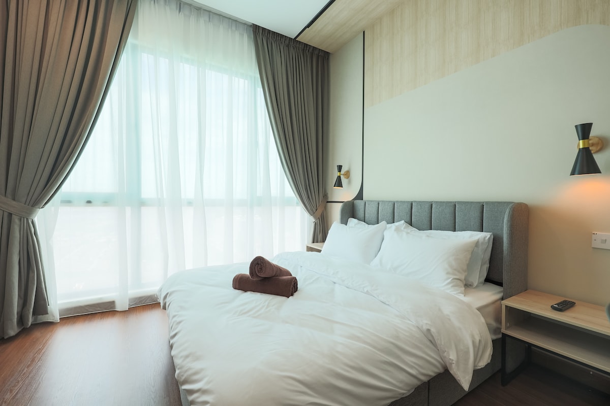 Surround yourself with style in this standout space. #Staycation #HaveFun AMENITIES: - 2 Super Single Bed in the master room - 1 Single Bed in the second room - 3 fresh Towels will be provided - Shampoo and Shower Gel - Washing machine (FREE to use~!) - FREE 1 parking - Hair dryer - Iron set - Fridge - Kettle - Induction Cooker - Microwave - WIFI (100mbps TIME Fiber) - Branded TV BOX (EV Pad) - Branded 4K Projector Screen (Over 120 inches) Check-in is from 3pm, and check-out is 11am