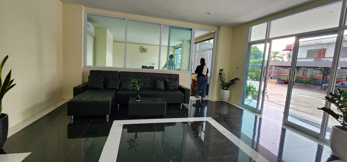 Este lugar único tiene un estilo propio. Habitación colorida con cama tamaño king, cocina americana, sofá y TV de 65pulgadas. Acceso a un jardín privado y piscina infinita. El animado Buriram , hogar de MotoGP y Maratón, así como Surin , el festival de la Ciudad de los Elefantes están a solo 30 km (posible servicio de traslado).
