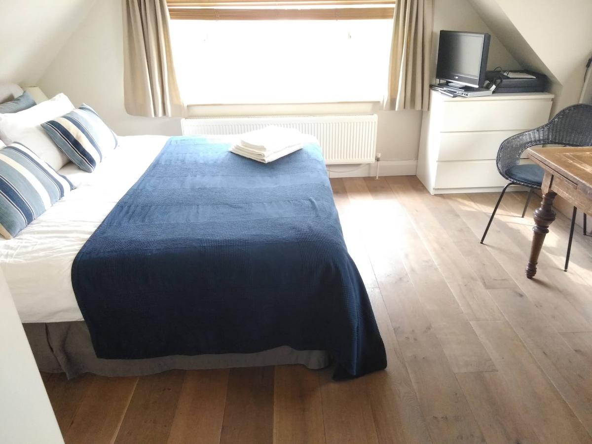 Esta luminosa y cómoda habitación doble en Staines upon Thames (para 1-2 personas) está a 15 minutos de Londres Heathrow y a 25 minutos del hipódromo de Ascot. Thorpe Park, Legoland y Windsor están a un trayecto en autobús de Staines. El acceso en tren a Londres está a 20 minutos a pie de la estación, luego a 35-40 minutos en tren, o a 5 minutos en coche del aparcamiento más cercano a la estación. El jardín tiene asientos y hay encantadores paseos a lo largo del río Támesis hasta las tiendas y restaurantes de Staines.