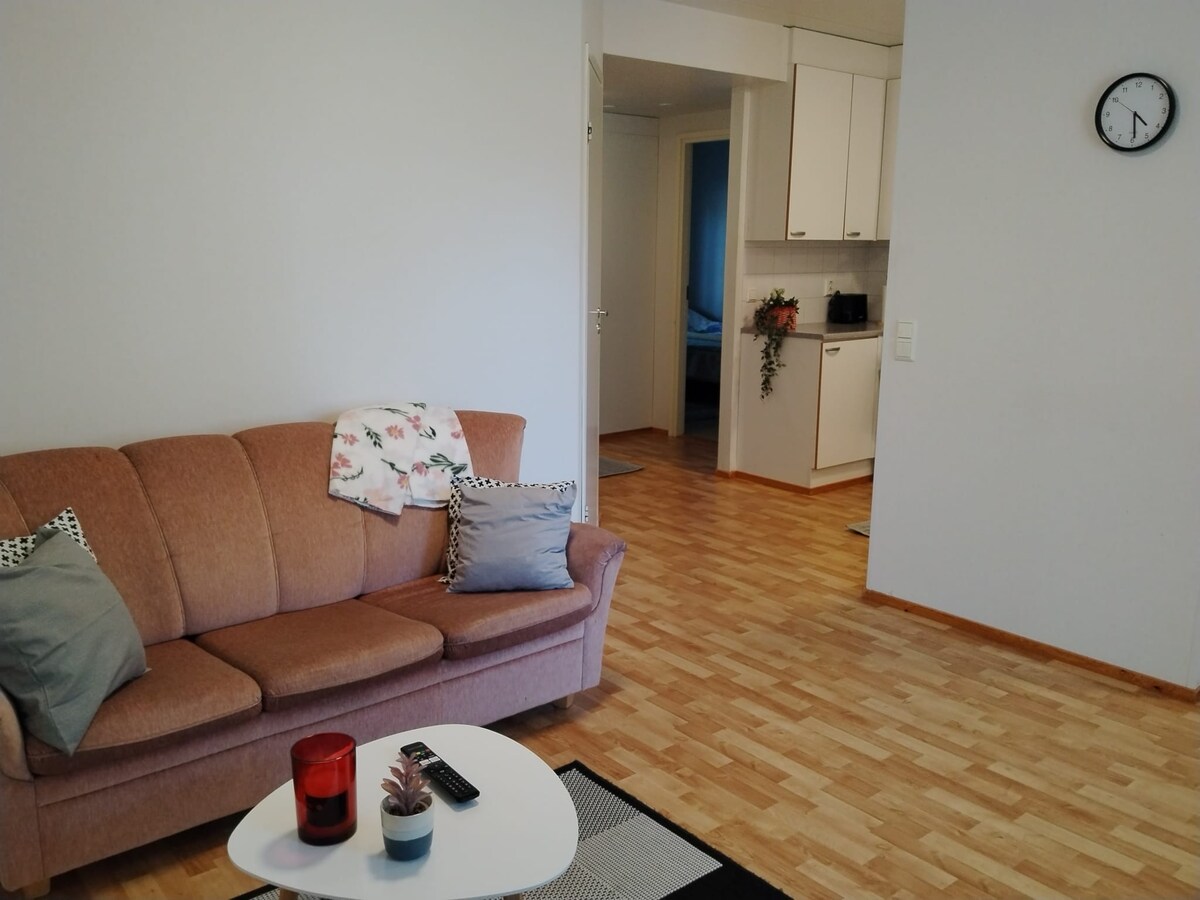 Apartamento de dos habitaciones, luminoso y con sauna (62 m2) en el centro de Teuva. El apartamento para no fumadores está en la planta baja de un edificio de 2 plantas. La tienda más cercana está a 150 metros. Todos los servicios cerca. Iglesia de Teuva a 1 kilómetro. Terraza cubierta, sauna, ducha, lavadora, lavavajillas, televisión, radio, cama doble y sofá cama desplegable para dos personas. Distancia al centro de Kauhajoki y Kaskinen 30 km, al centro de Kristiinankaupunki 38 km. El anfitrión está a 30 minutos.