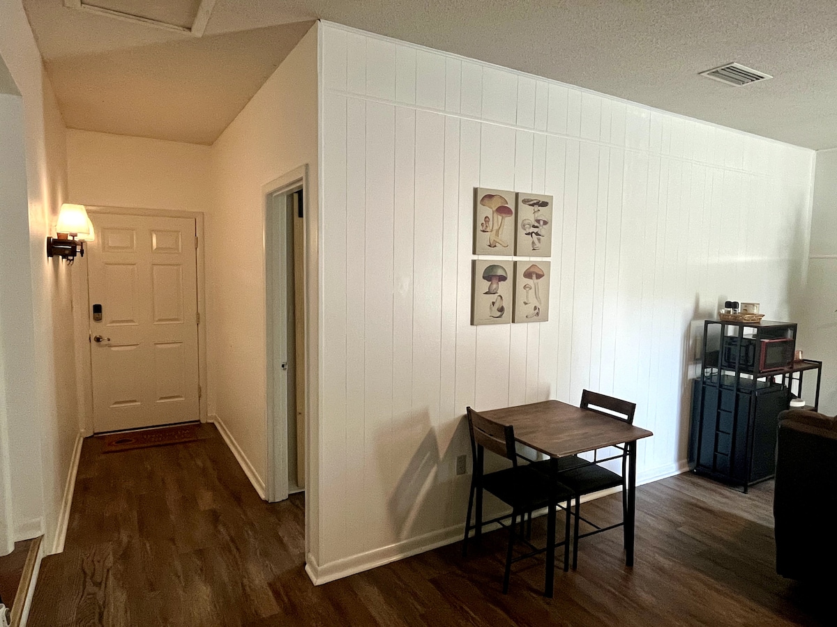 Esta acogedora habitación tiene su propia entrada y baño privado completo. Tiene una entrada privada bien iluminada con cerradura de puerta con teclado. Perfecto para una sola/pareja. - Cama tamaño queen. - Baño completo. - Cocina pequeña en la habitación con mininevera, microondas, horno tostador, keurig y lavadora/secadora. - 2 cómodas sillas para sentarse - Televisión Lg Roku - Acceso al patio trasero con una gran terraza de madera compartida, espacio para comer y un columpio en un entorno de jardín natural. - Adyacente a nuestra encantadora casa ubicada cerca del final de un callejón sin salida.