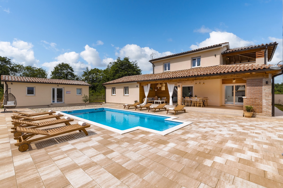 Stylish villa near Rovinj with picture worthy pool, sunk in hot tub, sauna. Wake up to lush, panoramic valley views. Couples and family-friendly, a short drive to adventure park, Brijuni National Park, dinopark, medieval towns & local cuisine. It is a true green escape for anyone looking to get back to nature with all the comfort of modern living. Fully equipped for cooking and entertainment in 2600 m2 of garden (football, speed ball, badminton & pool fun) for your kids and loved ones to enjoy.