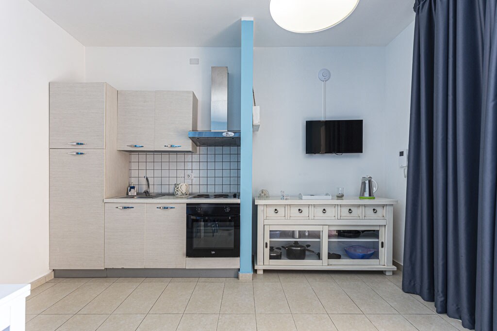 Los departamentos con vista a la piscina y al mar son departamentos de un dormitorio, una sala de estar y un baño privado con ducha y bidé. Cada uno en una terraza privada con vistas al mar de Fontane Bianche y piscina climatizada. Tienen una cama doble y un sofá cama, cocina americana equipada, artículos de tocador de cortesía, tetera y tetera de hierbas, nevera e Internet wifi, sauna común. La limpieza de la habitación con cambio de ropa de cama se realiza previa solicitud.