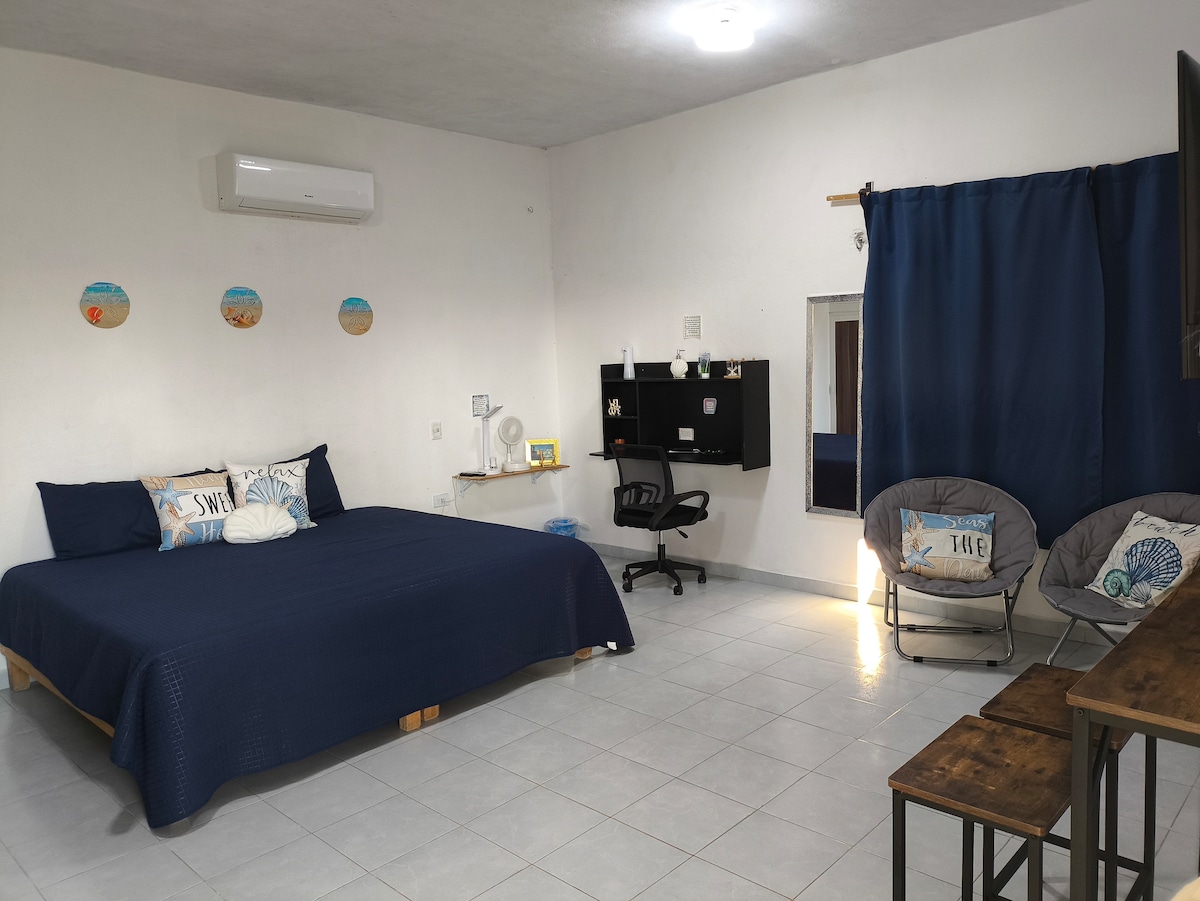 Pequeña suite a un lado de la residencia principal, esta aproximadamente a 200 metros del mar, hay alberca compartida con el fraccionamiento, es un lugar pequeño pero acogedor. Cuenta con todo lo necesario para una estancia corta. Es muy importante tomar en cuenta Que algunos días (casi siempre sábados) pudiera haber ruido de música de algunos vecinos del fraccionamiento y esto pudiera ser incómodo para algunas personas. Los demás días, es súper tranquilo, súper cómodo, agradable y de paz.