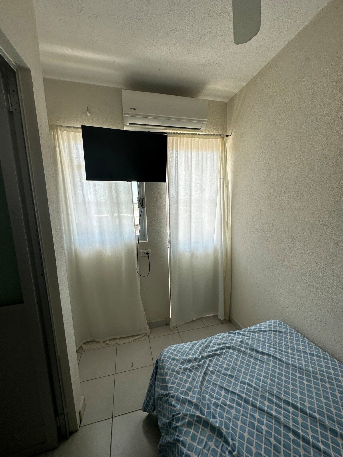 Pequeña habitación hasta para 2 personas se encuentra en un 3 nivel. Esta en un condominio de 3 departamentos con acceso limitado y seguro. La habitación cuenta cama matrimonial, Buro con lámpara, aire acondicionado, ventilador de techo, smart tv de 32”, barra / escritorio con frigobar, microondas, licuadora, parrilla eléctrica, vajilla, cubiertos y vasos para 2 personas, olla y sartén, baño con closet.