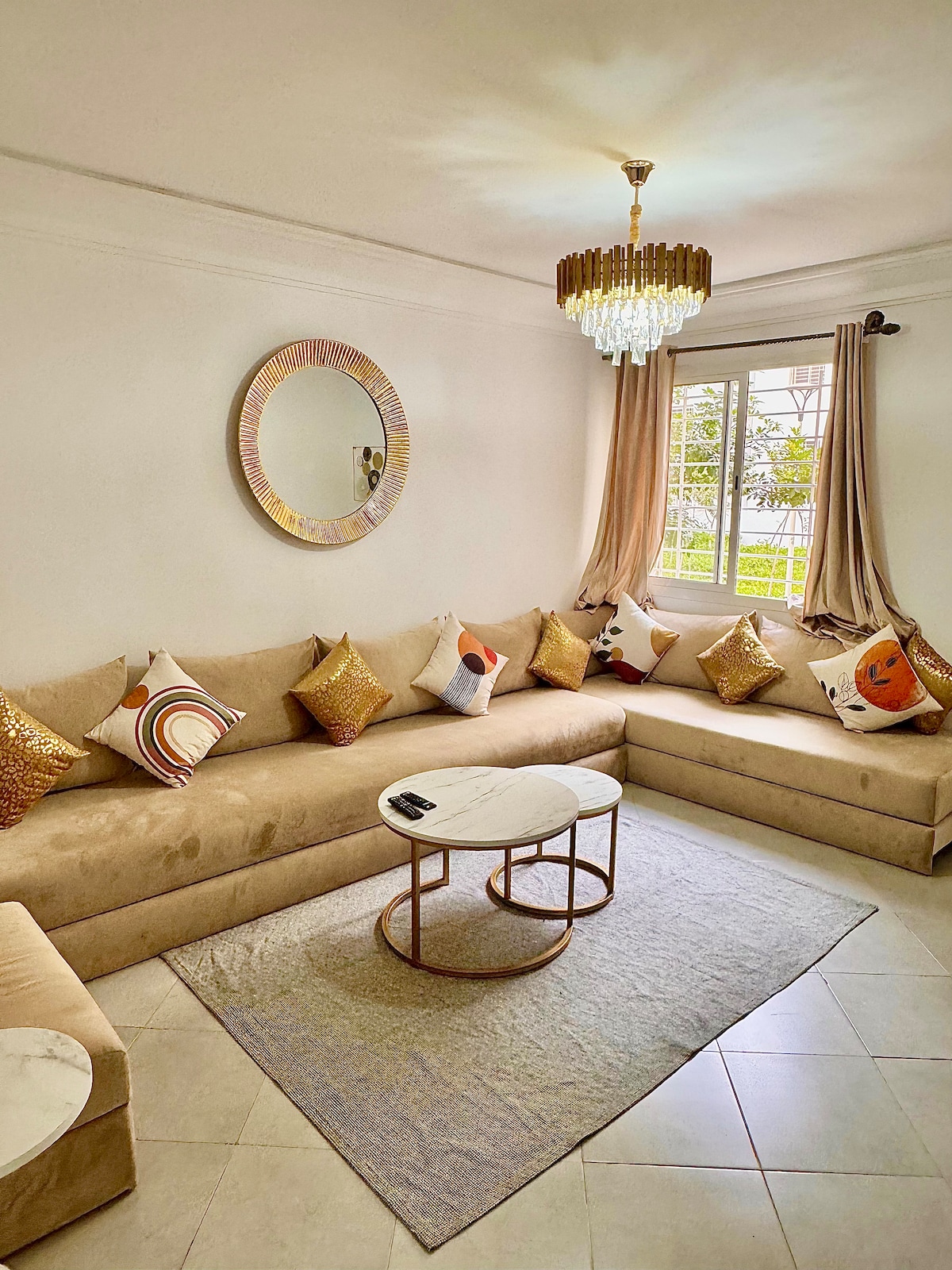 Acogedor y único apartamento (60 m²). Ubicado en una zona muy tranquila, en una comunidad cerrada*. A menos de 5 minutos de Agadir Beach Marina y a 10 minutos de los famosos centros turísticos costeros de Taghazout. La playa más cercana está a 600 metros del apartamento, accesible a pie o en coche. El apartamento ofrece un fácil registro de entrada autónomo con una cerradura inteligente. Este apartamento es ideal para pasar tus vacaciones en cualquier época del año y descubrir la soleada ciudad de Agadir y las costas, también es adecuado para estancias de negocios.