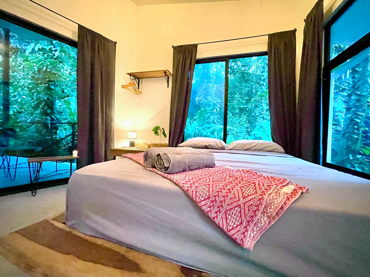 Estudio amplio, moderno y confortable con entrada privada. Ducha exterior e interior con agua caliente. Cocina equipada. Solo 5 minutos en bicicleta a través de la jungla hasta la playa. Disfrute de las comodidades modernas en medio de un paraíso selvático. Duerme con la relajante cacofonía de ranas y cigarras, y despierta con la energía de tucanes y monos. * No hay problema para llegar con cualquier vehículo, no se requiere 4x4 * *Muy cerca de 3 supermercados principales y carretera principal*