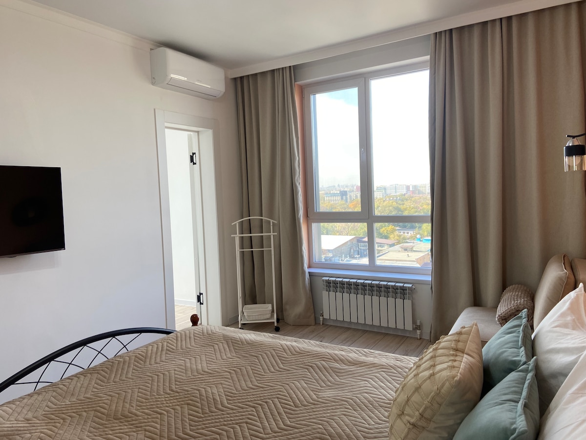 Welcome to your ideal stay in Almaty! Enjoy breathtaking mountain and city views right from your window. -7 minutes to Metro Station -сomfortable bed and cozy sofa -fully equipped kitchen -modern bathroom with fresh towels and toiletries - Wi-Fi and SmartTV The apartment is located in a safe and lively district, close to cafés, supermarkets, pharmacies, shopping malls! Self-check-in available Always ready to assist you — feel free to message any time. Relax, explore, feel at home!