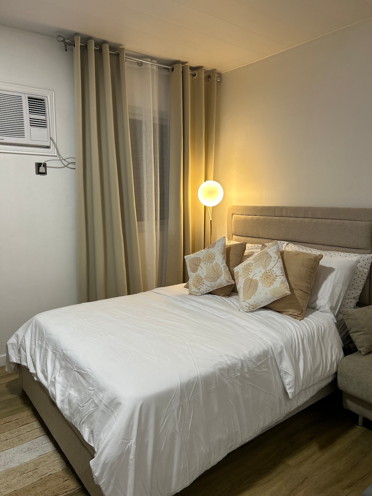Olvídate de tus preocupaciones en este espacioso y sereno espacio. Nuestro alojamiento está equipado con aire acondicionado, calentador de ducha, TV inteligente con Netflix, WIFI de alta velocidad, nevera, microondas, estufa de inducción y utensilios de cocina, hervidor de agua y arrocera. La propiedad tiene una cafetería, tienda de comestibles, lavandería, estación de recarga de agua, lavandería, gimnasio, centro de estudio/ espacio de trabajo, sala de belleza y una cancha de baloncesto. También está cerca de un centro comercial y un supermercado.