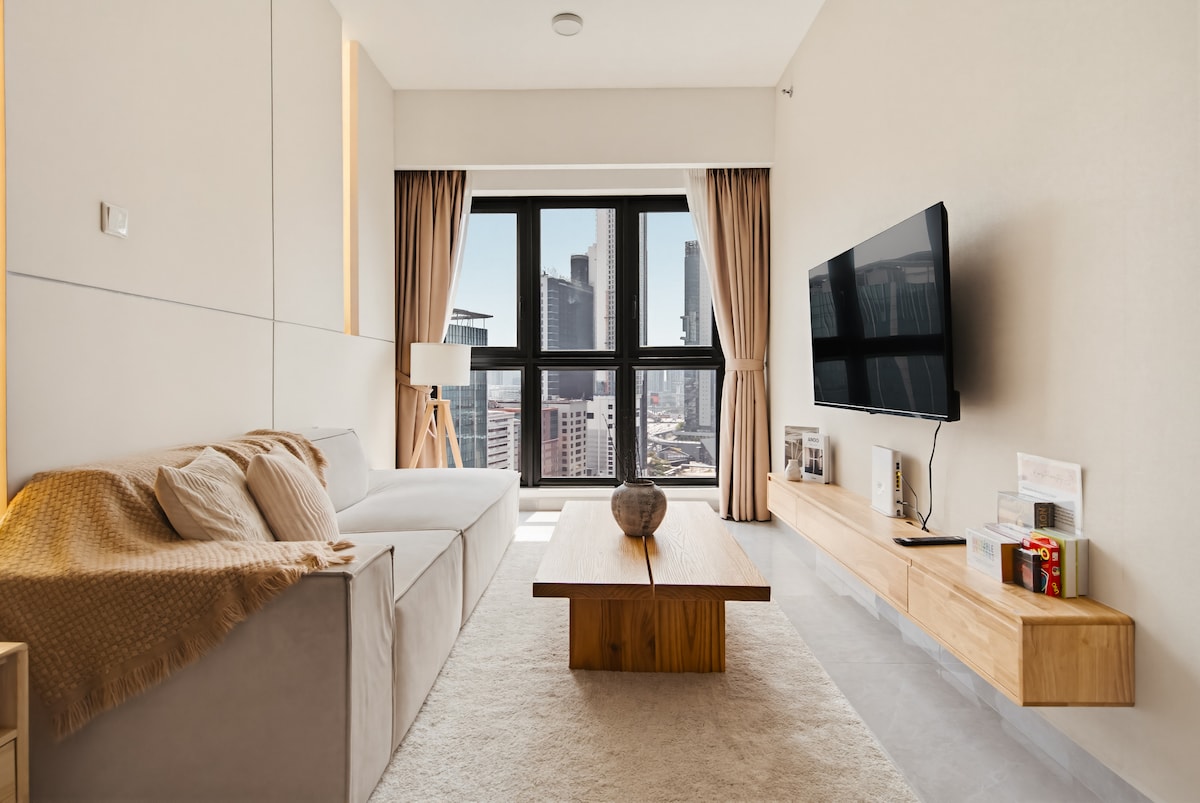 Este apartamento de 1 dormitorio cuenta con una vista impresionante del horizonte de KL. Cuenta con un salón con sofá de 3 plazas, mesa de comedor, cocina, escritorio y un gran balcón frente a la Torre KL y las Torres Petronas. Viene con TV de 55 pulgadas, wifi de alta velocidad y una cama tamaño queen en la que puedes acomodarte cómodamente. *La otra unidad de este apartamento de llave doble es un estudio compacto con cama tamaño queen, despensa, baño y bañera. Pueden caber amigos que viajan contigo con privacidad. ¡Te invitamos a solicitar más información!