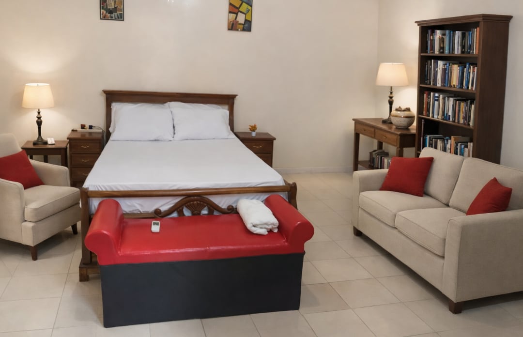 La habitación está situada en un jardín exótico tropical. Se encuentra en una terraza y con vistas al jardín. En ella encontrará una multitud de aves. En el barrio, todo está cerca (farmacia, mercado, supermercado, ...).