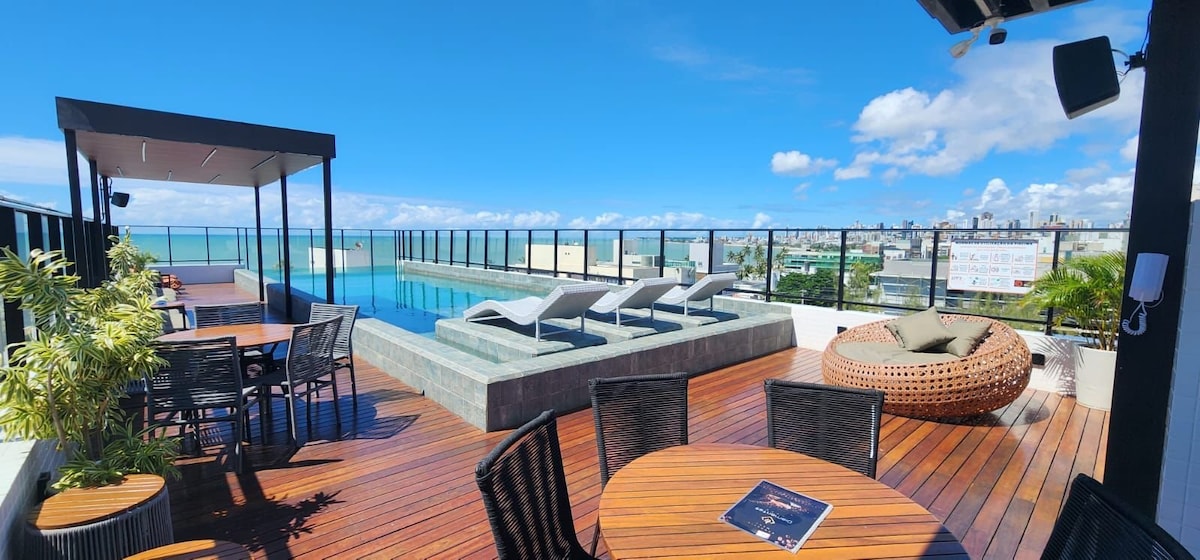 Este lugar único es el escenario ideal para un viaje inolvidable. Piso en el paseo marítimo de Cabo Branco, la playa más hermosa y visitada de João Pessoa. Cuenta con 1 cama de matrimonio y 1 cama individual con vistas al mar, TV por cable, internet, escritorio, minicocina para ahorrar en tu estancia y limpieza diaria. Tiene una piscina en la azotea con una vista exuberante para relajarse después de un hermoso día de turismo. Cerca de bares y restaurantes y del mirador. Excelente ubicación.