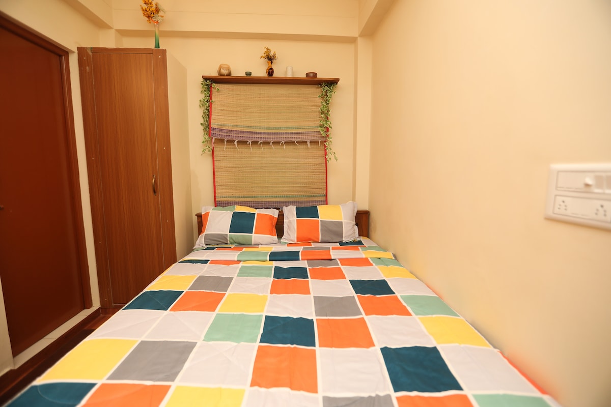 Una estadía acogedora en el corazón de Chennai en Nungambakkam. Esta habitación de 200 pies cuadrados incluye una cómoda cama doble, baño privado, escritorio y una cocina pequeña compacta. Ubicado cerca del Hospital Apollo, la Embajada de Estados Unidos, Khadar Nawaz Khan Road y T. Nagar, es perfecto para viajeros de negocios, visitantes médicos y compradores por igual. Disfruta de la comodidad, la comodidad y el fácil acceso a los principales lugares de interés de Chennai.