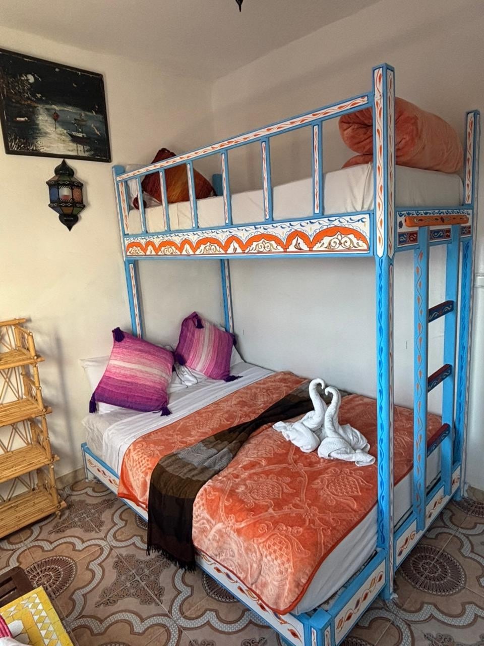 Esta habitación doble está situada en la azotea cerca de la terraza común, es la única con baño privado, es sencilla pero cómoda. Nuestro albergue está en el corazón de la antigua medina, cerca de la mezquita y la plaza principal. ¡Buen panorama!