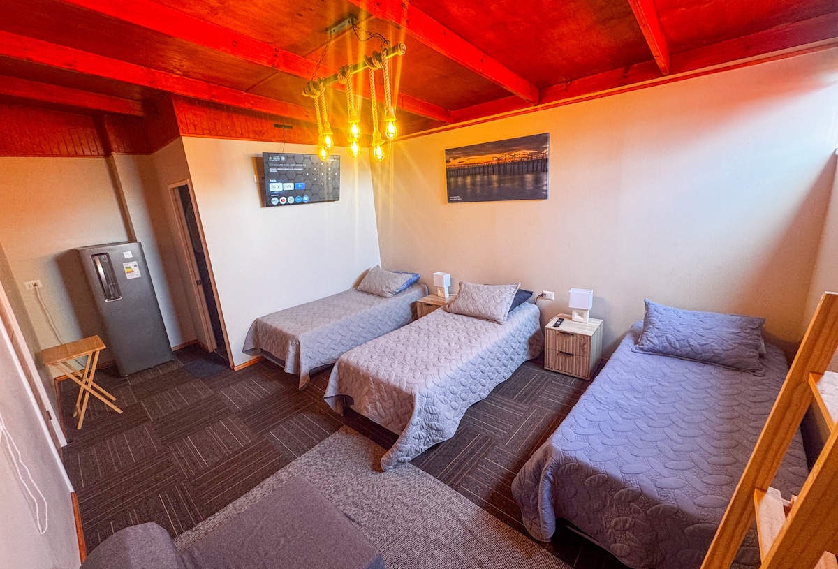 Cómodo y familiar donde podrá disfrutar de independencia en su descanso. A pasos de Playa Cavancha. Son dos habitaciones, una matrimonial y otra doble. Matrimonial (valor $50.000), tres personas ($60.000) y cuatro personas ($70.000 en total). Wifi disponible, zona tranquila, céntrica, cerca a supermercados, restaurantes, estación de servicios, clínica, parque infantil y el maravilloso borde costero y playa.