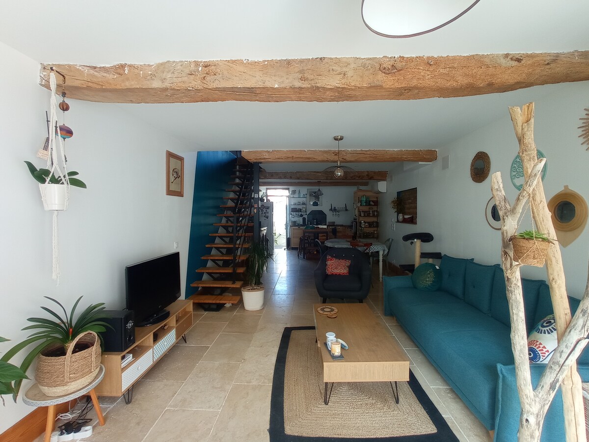 Una casa de 1970 totalmente renovada y decorada al estilo de los años 70, con una vista de gran angular de los tejados, la iglesia y su campanario, la torre medieval y el montículo del castillo en un entorno verde. Sin vecinos. También es un jardín de terrazas donde conviven flores y pájaros, un jardín donde es agradable tomarse el tiempo, en una hamaca, en una tumbona vintage o alrededor de una mesa. Acceso a pie en 5 minutos al centro del pueblo, sus mercados, sus tiendas, sus bares y restaurantes.