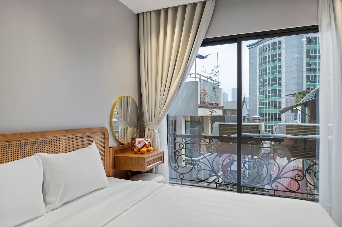 🌿 Deluxe 45m² – Balcony & Bathtub | Central Ha Noi 🏡 Details: Size: 45m², spacious and comfortable design Bed: 1 king-size bed (1.8m x 2m) with a soft mattress Bathroom: a bathtub and a standing shower, including 5 sets of towels and 5 sets of personal amenities Amenities: Refrigerator, electric kettle, TV with Netflix, safe box, free drink water, coffee, and tea Private Balcony: Airy with a beautiful view ✨ Included Services: Free breakfast Free swimming pool Free basement parking