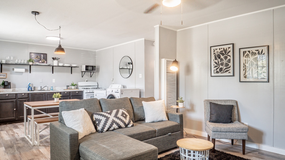 This new backyard guest house is on a tree-lined street. Full kitchen with gas range is perfect for weekend dinners or to stay longer. The decorative welcome sign folds up to a table for two. The living room is a perfect place to unwind with WiFi and AppleTV or an assortment of books. It is pet friendly and can accommodate kids on floor pallets, if needed. This house is in our family's backyard, but we make sure you have a private stay.