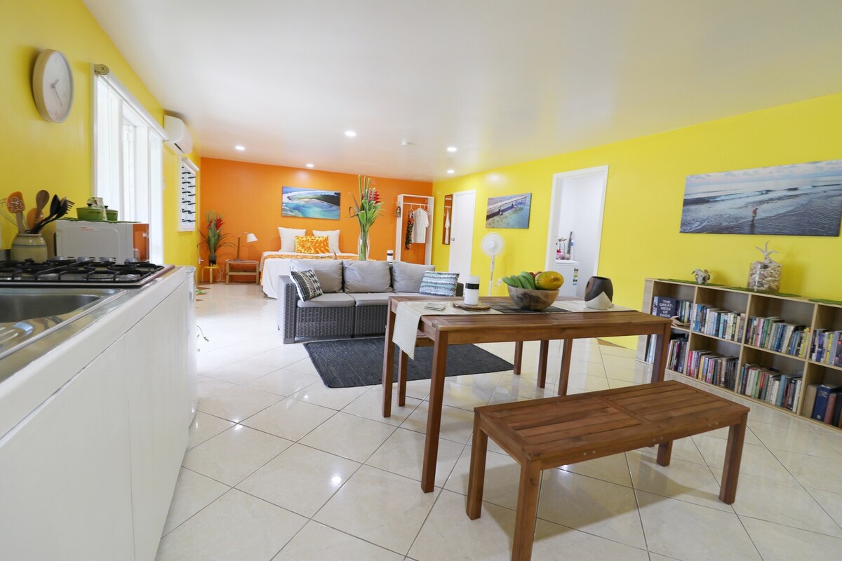 Un encantador estudio privado independiente, con ventilador, aire acondicionado y mosquitera, con todos los servicios necesarios. Con vistas a tu propia piscina de inmersión y hamacas. Este estudio cuenta con una cocina bien equipada con placa de gas, microondas y TV inteligente. En la amplia terraza podrás disfrutar de las instalaciones de barbacoa Webber. Un armario que contiene todos los cambios de ropa de cama y toallas de piscina. Ofrece WIFI ILIMITADO DE CORTESÍA y acceso a Netflix PrimeVideo, Disney+.