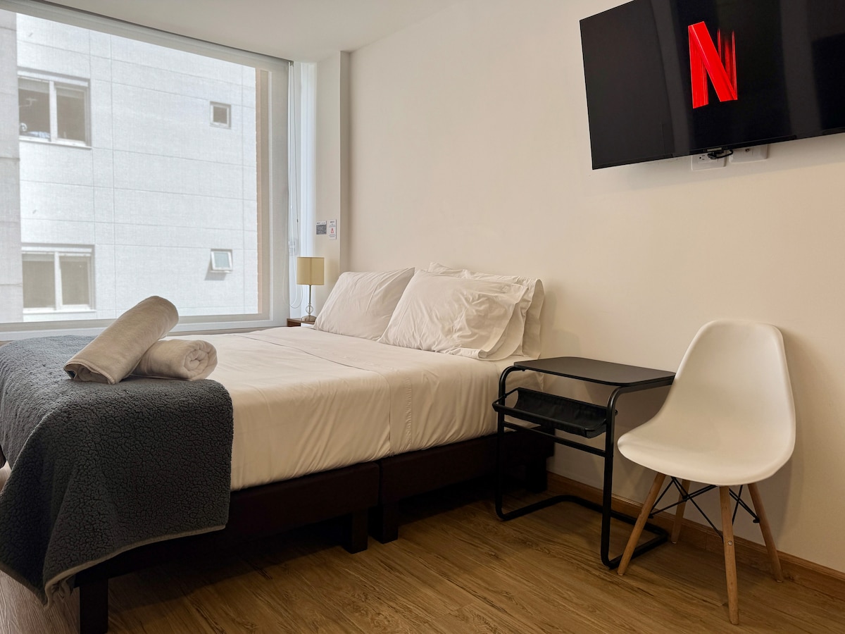 Este moderno y acogedor espacio tipo habitación de hotel tiene todo lo que necesitas para una estancia agradable y única en Bogotá. Cuenta con una cocina totalmente equipada, un diseño con personalidad y lujoso, aislado del ruido exterior, lo que lo hace perfecto para una estancia tranquila. El edificio cuenta con comodidades como gimnasio, terraza 360, Asador-BBQ, Co-working, y restaurante-cafetería. Todo esto sumado a su excelente ubicación lo convierten en un destino infaltable.
