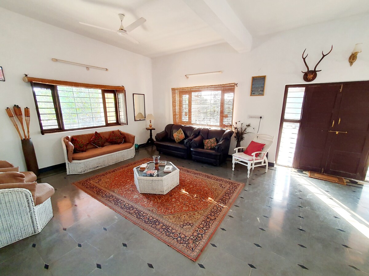 Spacious, elegantly designed duplex farmhouse villa beautifully blends rustic charm with modern sophistication. It features 4 fully furnished bedrooms with attached bathroom, a sparkling swimming pool, a lush green lawn, children play area, adults box cricket and much more to offering the ultimate comfort and relaxation. Please Note: Drinking alcohol strictly prohibited inside the farmhouse.