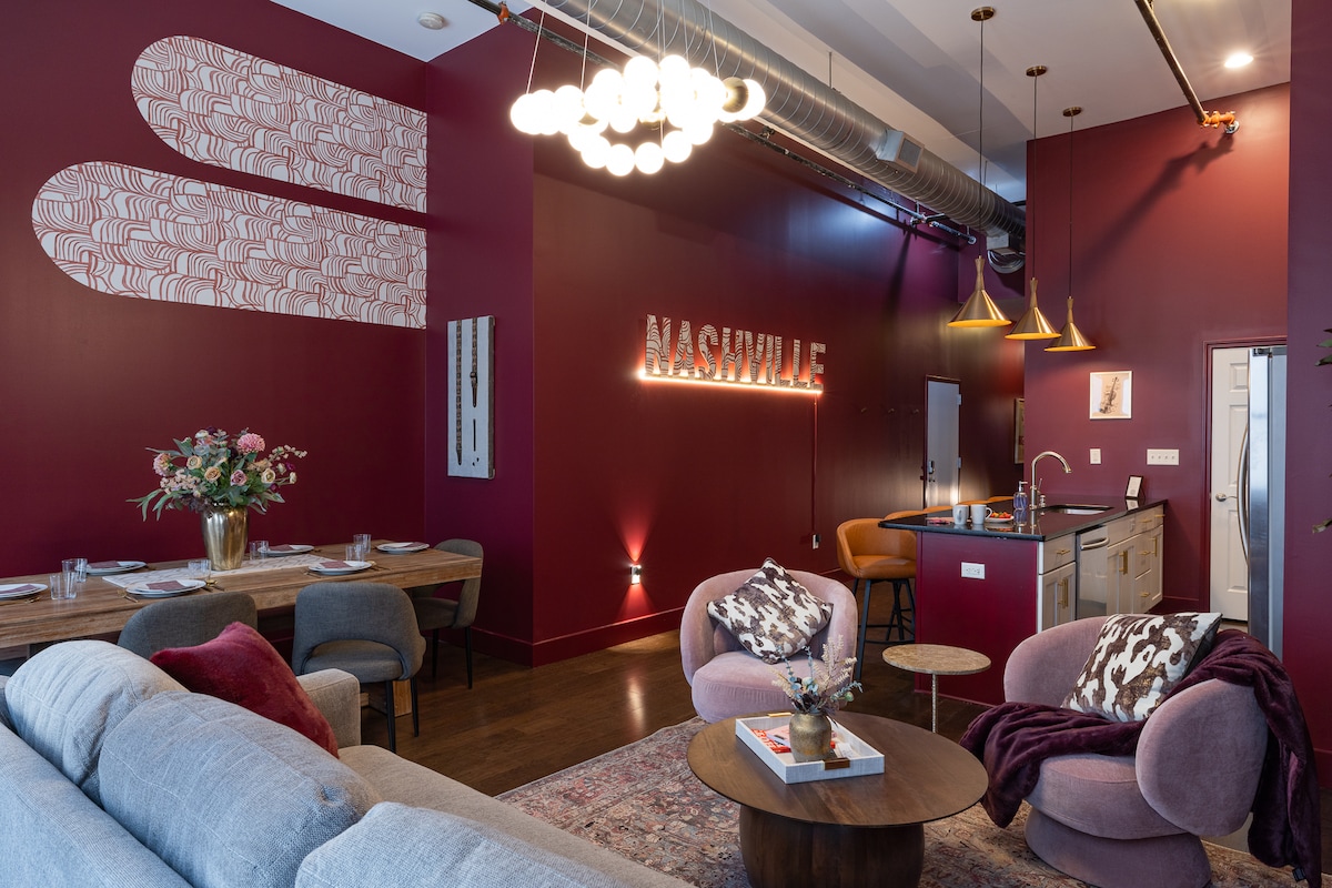 Step into our incredible downtown apartment designed to feel warm, romantic, and effortlessly stylish! Newly re-designed & near the corner of 5th Ave N and Union Ave, this charming & modern loft looks out over the heart of Downtown Nashville. The moment you walk in, the condo welcomes you with soaring high ceilings and rich rosy tones that create an inviting, cozy atmosphere. Perfect for business travel & leisure! You'll love being a quick walk from all downtown businesses and restaurants.