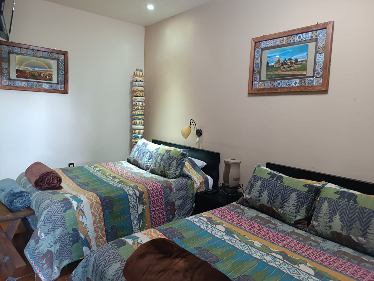 Espacio bohemio con estacionamiento, jardín, terraza, área de fogata, rodeado de árboles frutales, tele con Roku, internet de alta velocidad, cocina súper equipada, cortinas black out, espacio para trabajar y la mejor experiencia para dormir en un tapanco en la parte de arriba. Aire acondicionado y dos sillones cama extra para albergar hasta 4 personas. Colonia tranquila al lado del río, a 10 min en auto del centro de la ciudad, a 8 de la central de autobuses y a 6 del palenque de feria tepabril