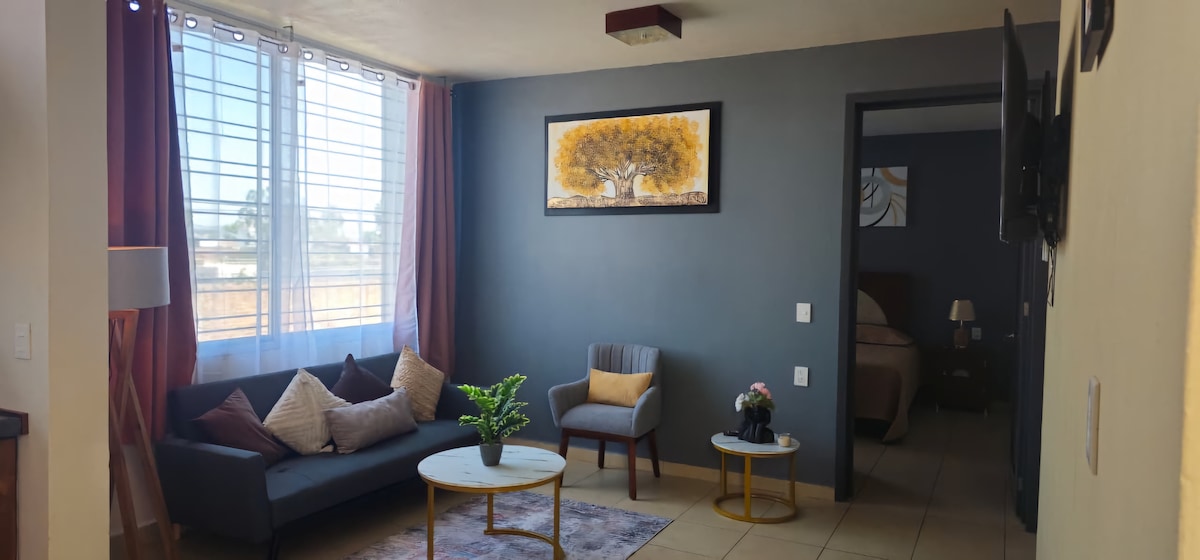 🔑 Disfruta de una estancia cómoda y relajante en este lindo departamento ubicado a sólo unas cuadras del centro de Tepatitlán. 🫂🧑🧑🧒🧒 Con una decoración cálida y acogedora, este espacio es ideal para todo tipo de viajeros: parejas, familias o quienes vienen por trabajo o algún evento o fiesta. 🛏️ Cuenta con 2 habitaciones y 1 baño, perfectos para descansar. 🍳 Cocina equipada con estufa, refrigerador, microondas, cafetera y lo básico para cocinar 🚗 Cuenta con una cochera amplia