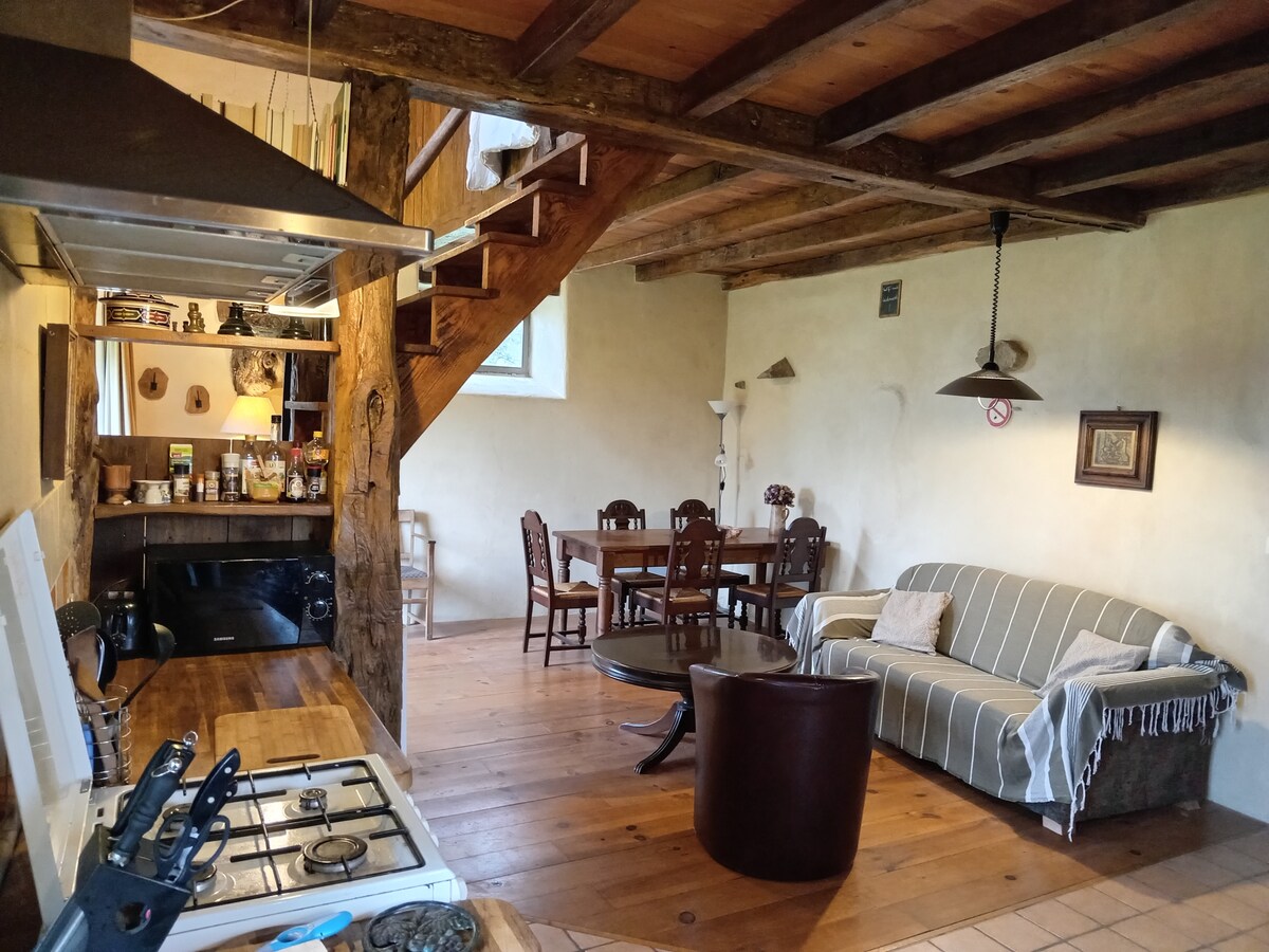 Een comfortabel vakantiehuis, gîte, voor maximaal 6 personen. Beneden vind je de keuken met eettafel, het sanitair en de zitruimte. Boven vind je 6 enkele bedden, 2 op de mezzanine en 3 plus een schuifbed aan de andere kant van de kamer, die middels een lichtdicht gordijn gescheiden kan worden van de mezzanine. Rondom het huis heb je een prachtig terras met een fantastisch uitzicht.
