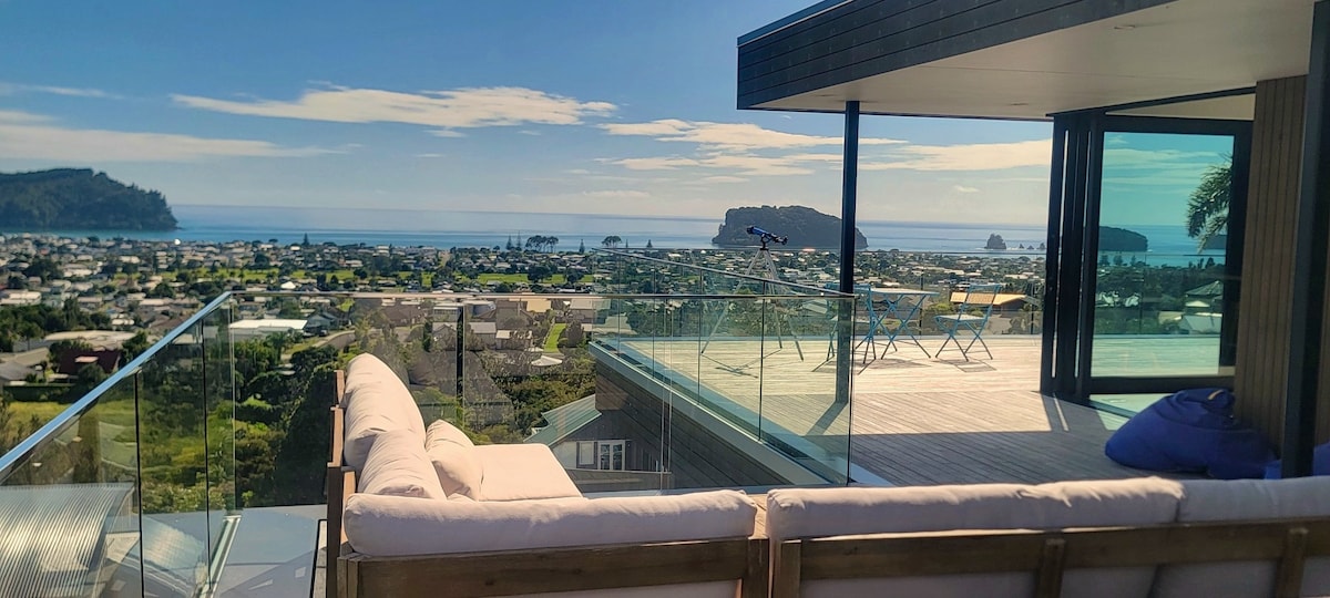 *VILLA / POHUTUKAWA LODGE* Piece of Heaven in Paradise! Private New Modern Spacious 3 Bedroom Holiday Home with Large Spacious Open Plan Living / Large Decks. Ideal for Mature People; Couples, Families and is Child Friendly. Set Amongst Natural Native Bush & Birds, 3.5 acre Peaceful Environment, Hear the Native Tui Bird Song, Hear the call of Our Native Kiwi at night. Relax & Enjoy Peace & Serenity of 360° Panoramic Views, Beautiful Sunsets & Starlit Nights