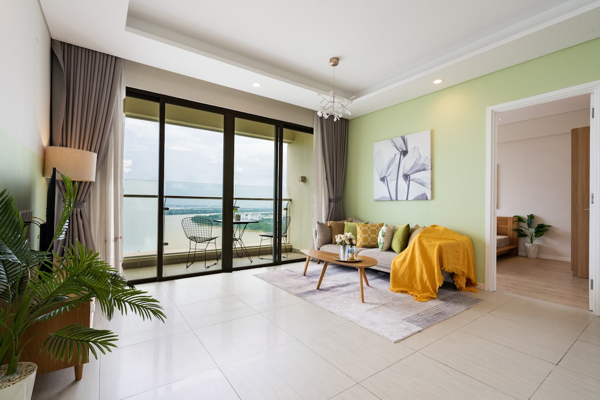 Relájate en este lugar único y tranquilo para hospedarte en Diamond Island. El apartamento con vistas al río es fresco todo el día, con 1 dormitorio de cama doble y 1 sofá cama en la sala de estar. El departamento está totalmente diseñado tanto para vacaciones cortas como largas. Los huéspedes tienen acceso gratuito a los servicios públicos internos: piscina olímpica, piscina mineral de sal, jacuzzi... Internet de alta velocidad de 150 Mbps. Disfrutemos del espacio de vida verde y tranquilo.